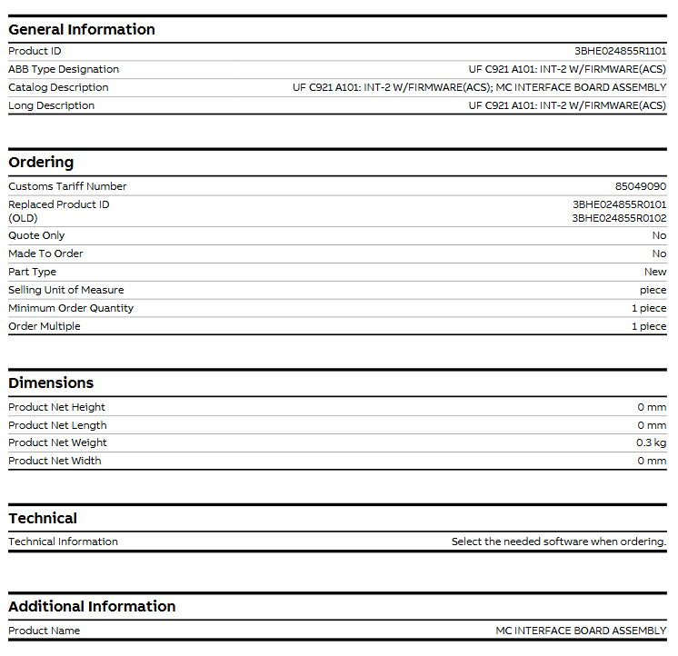 ABB UFC921A101, ABB tarafından endüstriyel sürücü ve otomasyon ürün grubu için tasarlanıp üretilen, özel, yüksek düzeyde entegre bir INT-2 tipi MC arayüz devre kartı bileşenidir. 3BHE024855R0101, doğrudan saha kablolamasına bağlanabilen bağımsız bir modül değildir; bunun yerine, ABB'nin daha karmaşık sürücü veya kontrol cihazlarına derinlemesine entegre edilmiş temel işlevsel bir alt sistem olarak hizmet eder. Temel misyonu, yüksek hızlı ve güvenilir veri alışverişi, komut aktarımı ve durum senkronizasyonu sağlayan Ana Denetleyici olarak hareket etmektir. Yerleşik Firmware, ana sistemle kusursuz iletişim ve verimli işbirliğine dayalı çalışma sağlayan zekanın yattığı yerdir.