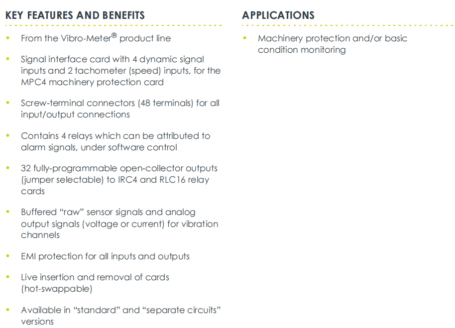 Marka: Titreşim ÖlçerAçıklama: Giriş/Çıkış KartıDurum: YepyeniSertifika: COO TEST RAPORU GARANTİ MEKTUBUGaranti: 1 yılEnvanter Adeti: 4Ödeme Süresi: T/TNakliye Limanı: XiamenIOC4T 200-560-000-011 giriş/çıkış kartının ana işlevi, sensör sinyallerini alıp bunları işlenmek üzere MPC4'e aktarmak ve işlenen sinyalleri çıkış arayüzü aracılığıyla harici bir sisteme iletmektir.