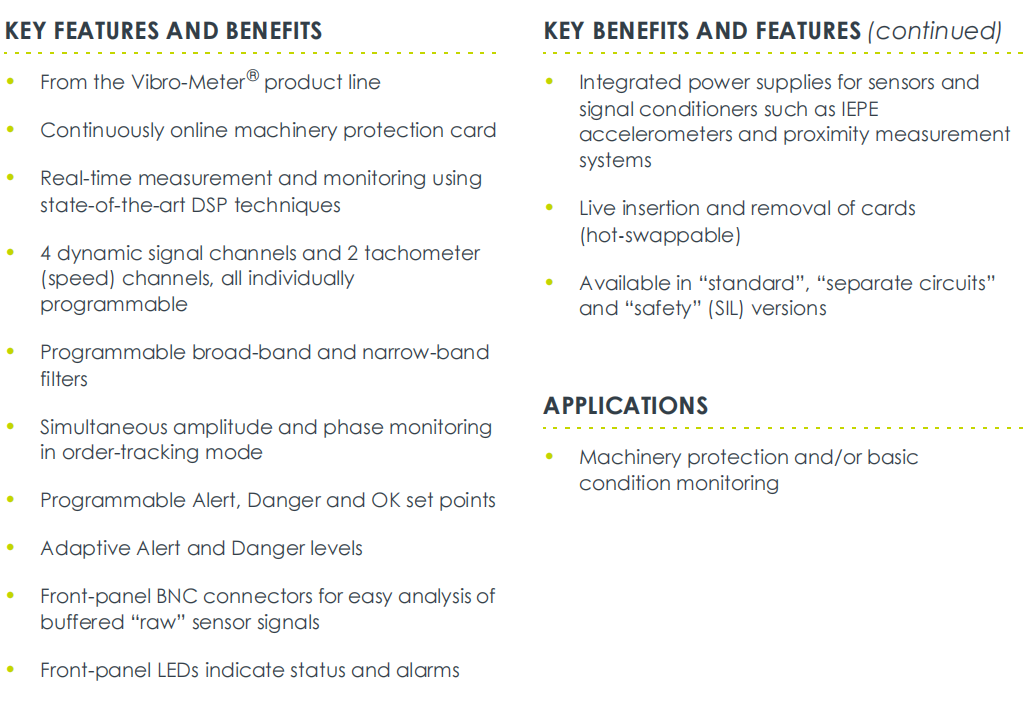 MPC4 200-510-070-112, Meget'in titreşim ölçer ürün serisinden yüksek performanslı, sürekli çevrimiçi mekanik koruma kartıdır. Makine koruma kartı, zorlu endüstriyel ortamlarda kritik dönen ekipmanların gerçek zamanlı izlenmesi ve korunması için kullanılan VM600 serisi mekanik koruma sisteminde (MPS) merkezi işlem elemanı olarak görev yapar.